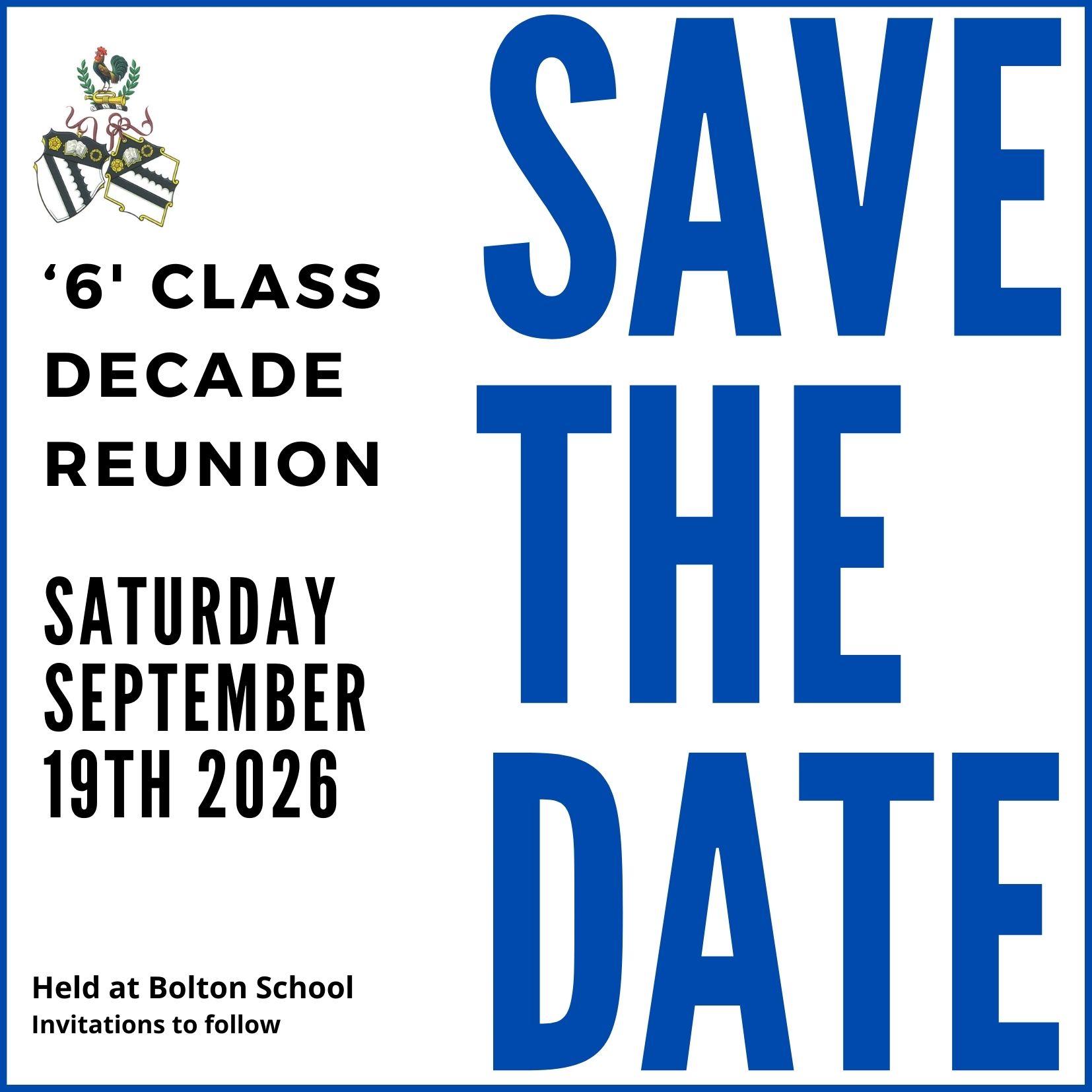 Alumni are invited to Save The date for the next decade School Reunion - this year celebrating all those that left School in a '6' year.