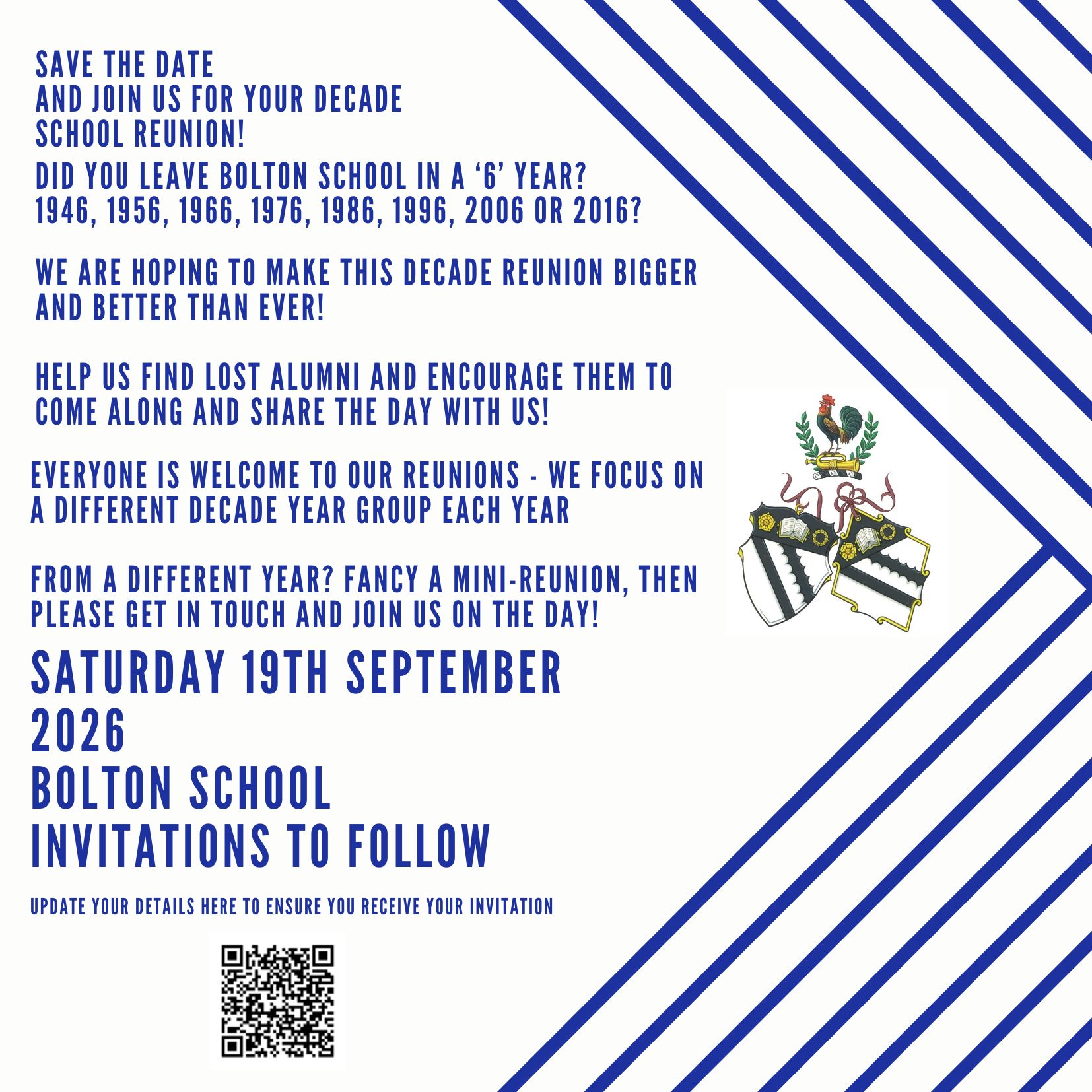 If you left School in 1946, 1956, 1966, 1976, 1986, 1996, 2006 or 2016 then please do keep the date in your diary and look out for invitations arriving in the post or by email!